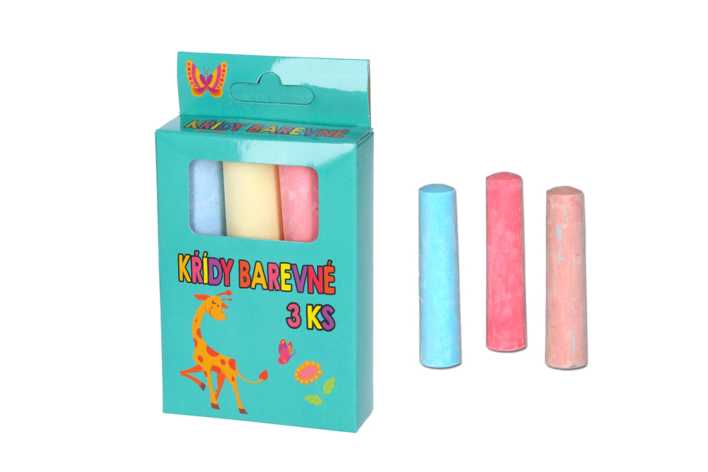 3 kusy barevných chodníkových kříd v papírovém boxu. Křídy nejsou vhodné pro děti do 3 let.