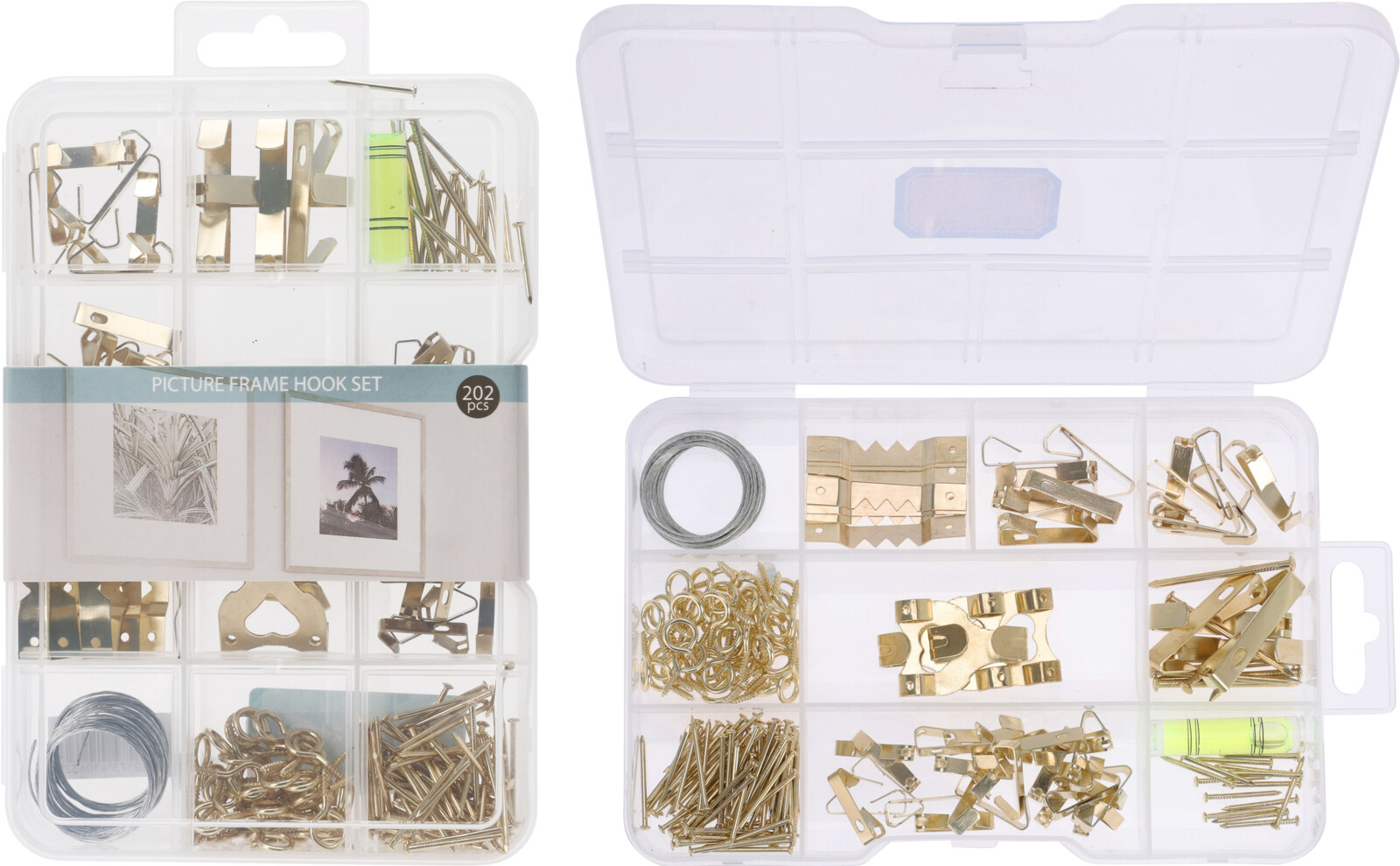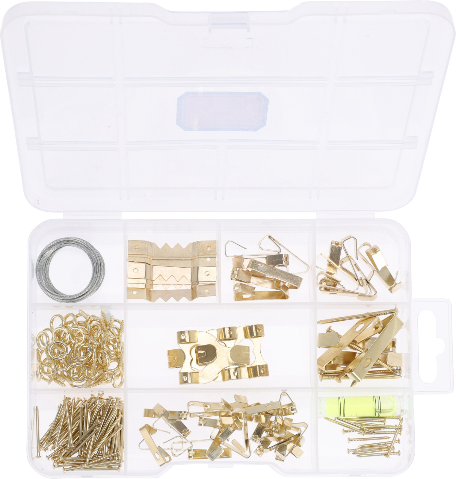 Sada obsahuje: 3 x 45LB závěs, 24 x 10LB závěs, 8 x 20LB závěs, 7x 30LB závěs, 4 x 50LB závěs, 50 x 1 šroub s okem, 80 x 1 hřebík, 16x 3/4 hřebík, 8 x 40 mm hřebík 6FT, 1 x 40 mm vodováha.